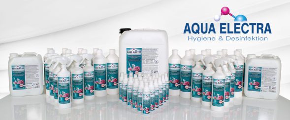 Alle Produkte von AQUA ELECTRA sind alkoholfreie Desinfektionsmittel ohne zusätzliche Inhaltsstoffe. Sie sind nicht brennbar, enthalten keine Phenole, Tenside oder Farbstoffe und gelten nicht als Gefahrgut. Unsere Produkte bekämpfen 99,99%* der Bakterien, Keime, Sporen, Hefepilze, Legionellen sowie Viren, einschließlich der CORONAVIREN (SARS-CoV-2). Alle AQUA ELECTRA Produkte wurden in akkreditierten Laboren getestet.